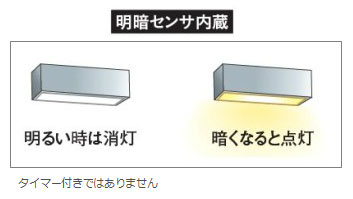 仕様 明暗センサー内蔵(タイマー付きではありません) 光源:LEDモジュール 電球:LED(電球色)1.6W(2900K) 入力電圧:AC100V 指定ワット数以上の電球を使用しますと火災などの原因になりますので付属の取り扱い説明書をご覧になり規定ワット数以下の電球をご使用ください。